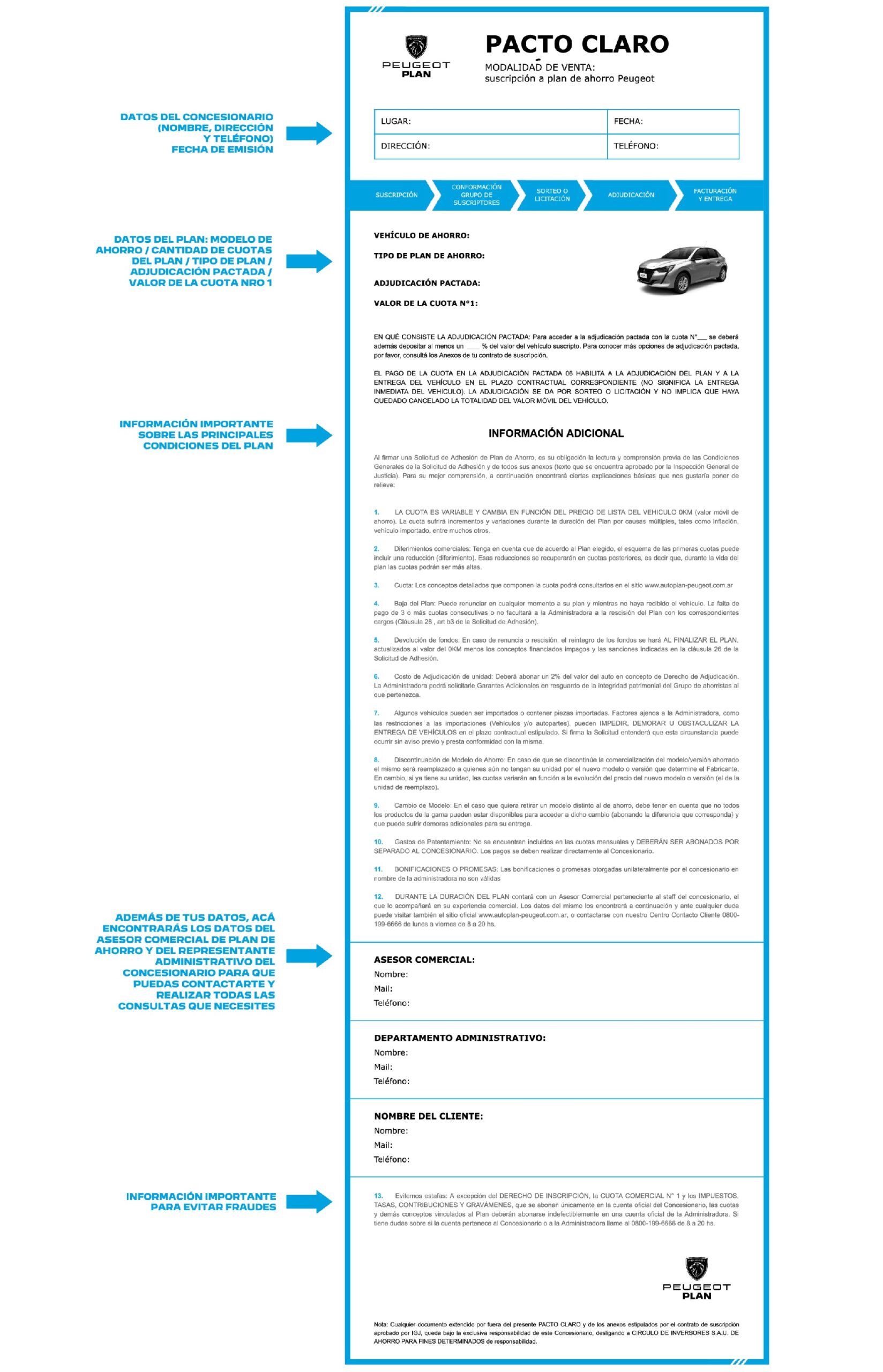 Es un documento formal con información sencilla, concisa y fácil de entender que se extiende a todos los clientes que inician una suscripción a un Plan de Ahorro. Cabe destacar que esta herramienta no reemplaza el contrato de suscripción original, sino que anticipa puntos de importancia a tener en cuenta. El mismo contiene: información sobre el vehículo a adquirir, datos útiles sobre las cuotas, tiempos de entrega e información en general que PEUGEOT PLAN pretende que quede bien en claro antes de iniciar la experiencia de un Plan de Ahorro. Es importante señalar que Pacto Claro incluye, más allá de los datos del asesor comercial, los datos del área administrativa del concesionario con el correspondiente asesor de cuenta.